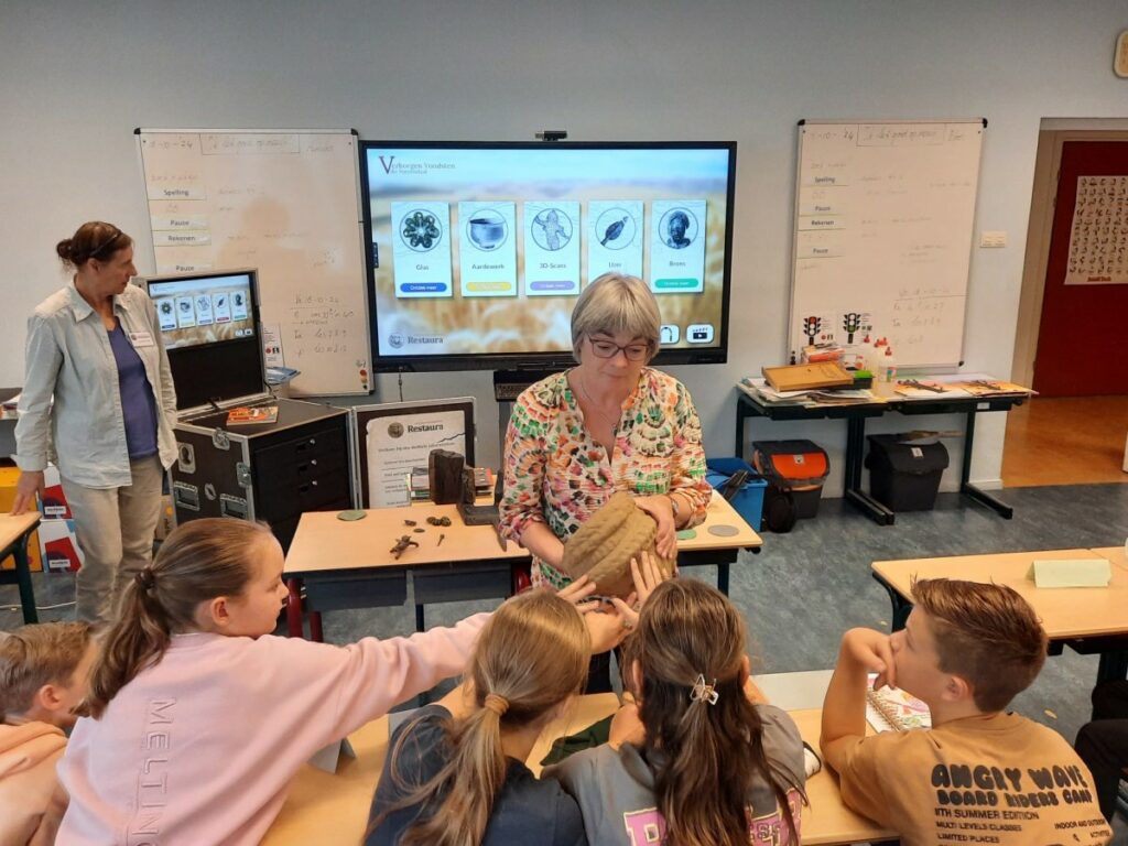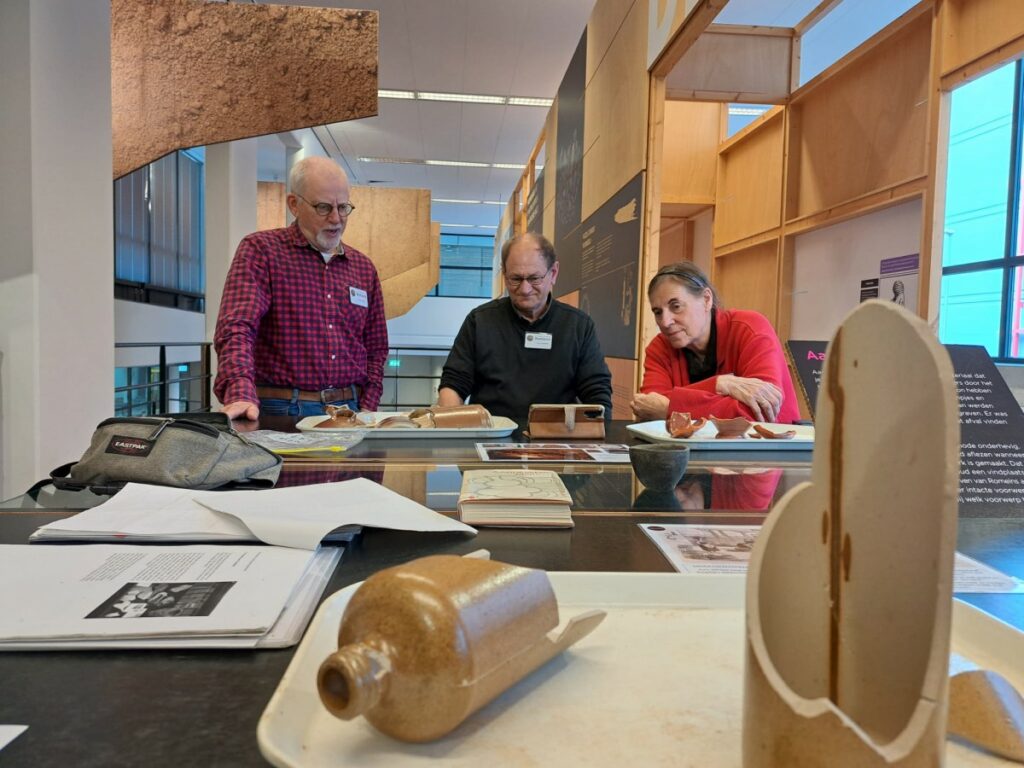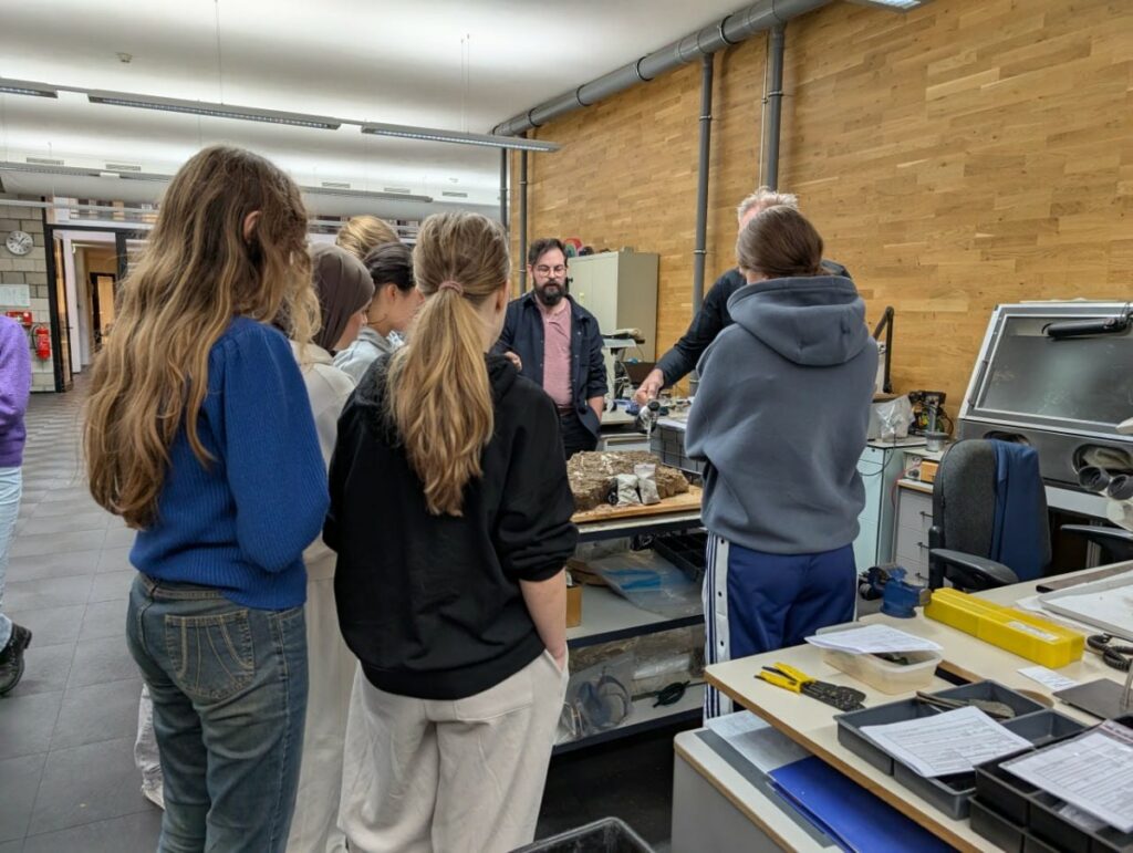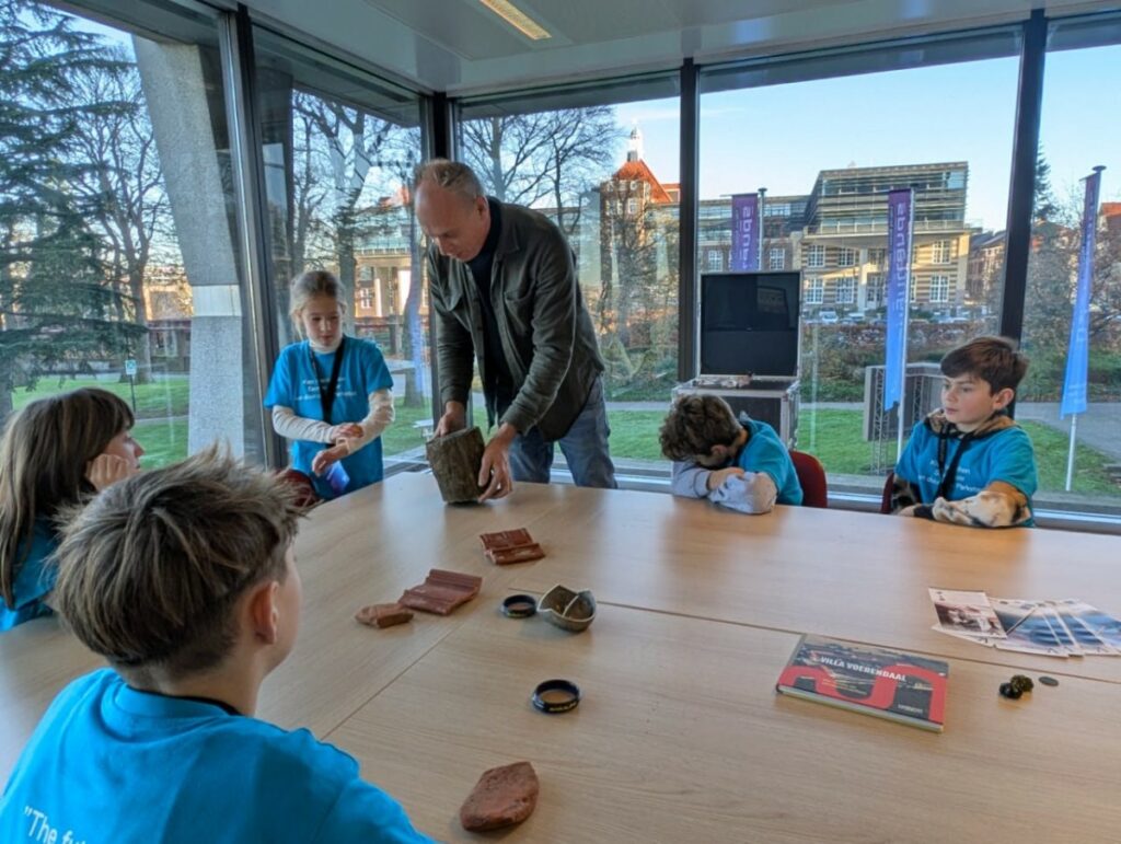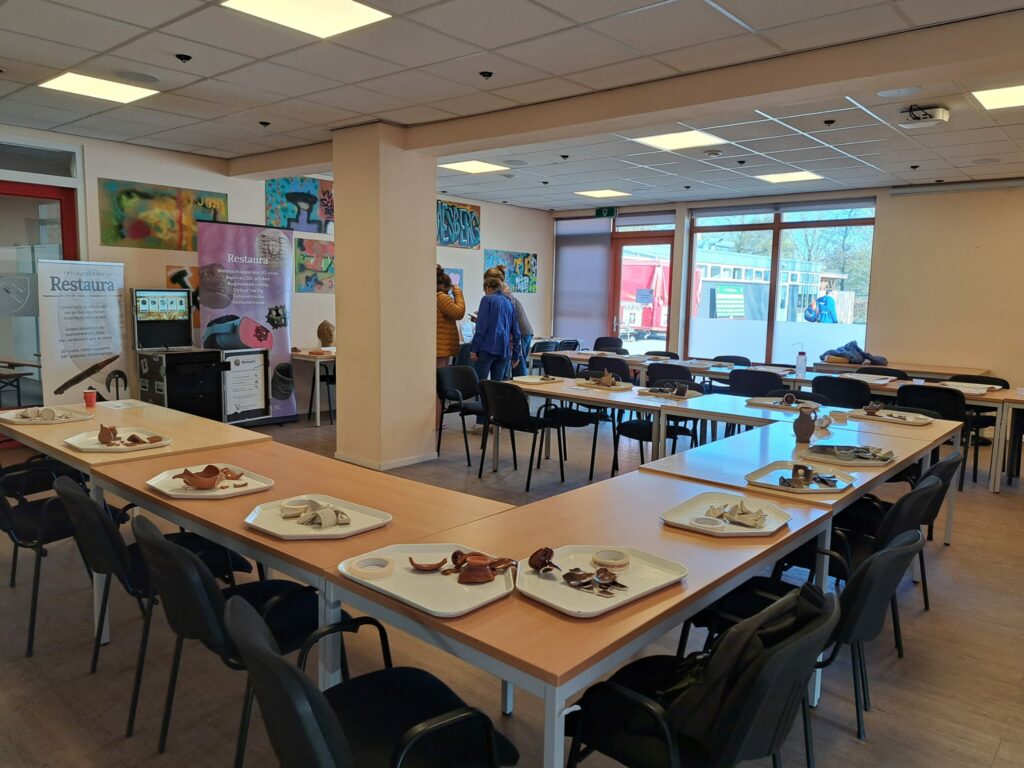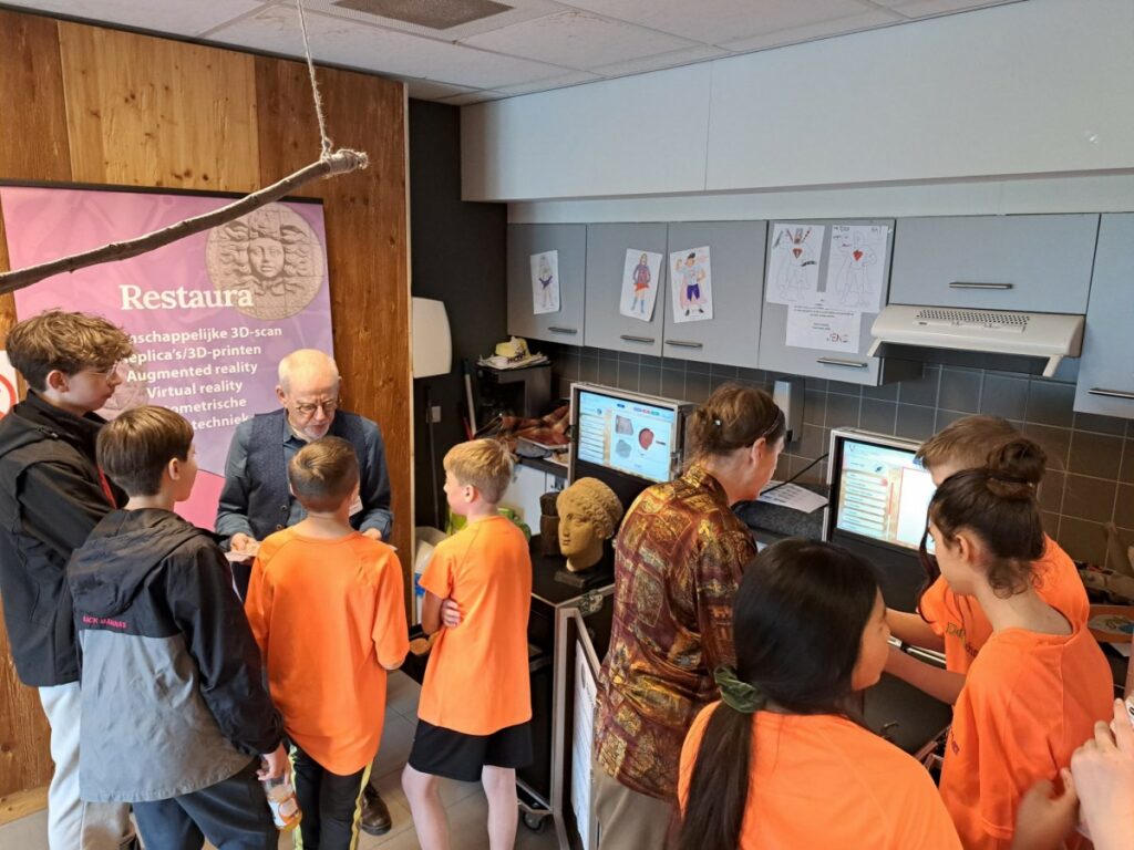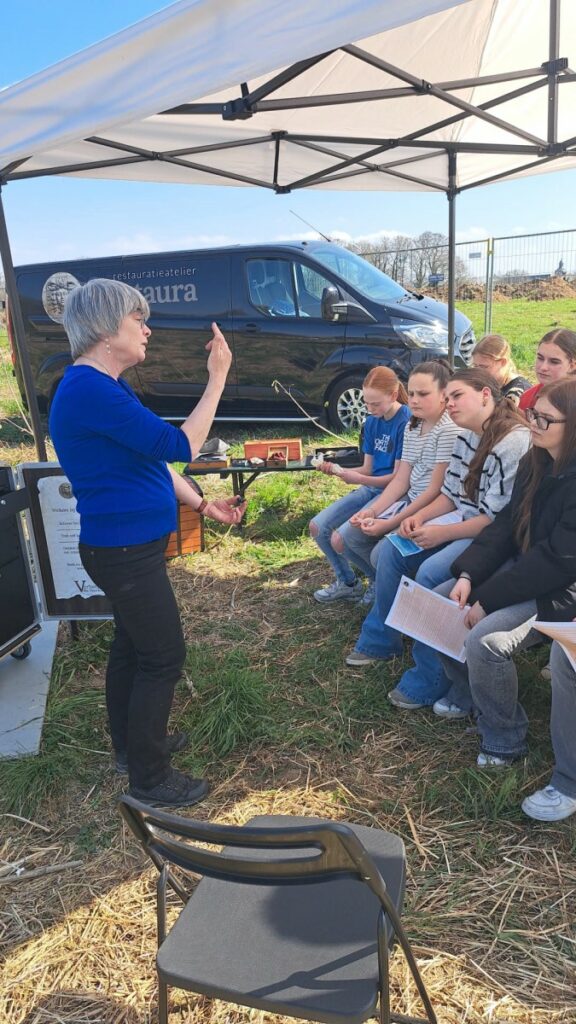 Een select gezelschap van vijf archeologiestudenten en docent Mark Driessen bezocht onlangs Restaura. Vanuit Leiden keken bovendien 80 studenten mee met de livestream. Ze kregen een rondleiding in het atelier en er werd gesproken over het vak. Via Whatsapp konden ook de studenten in Leiden van zich laten horen.