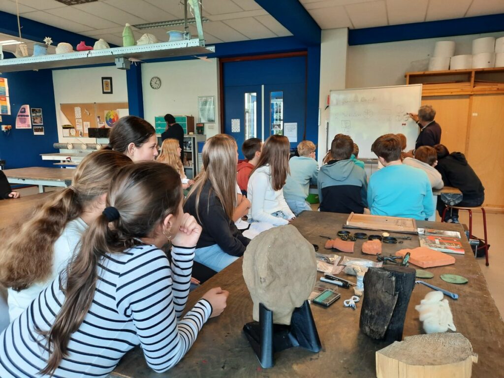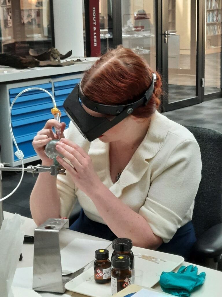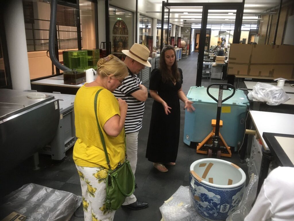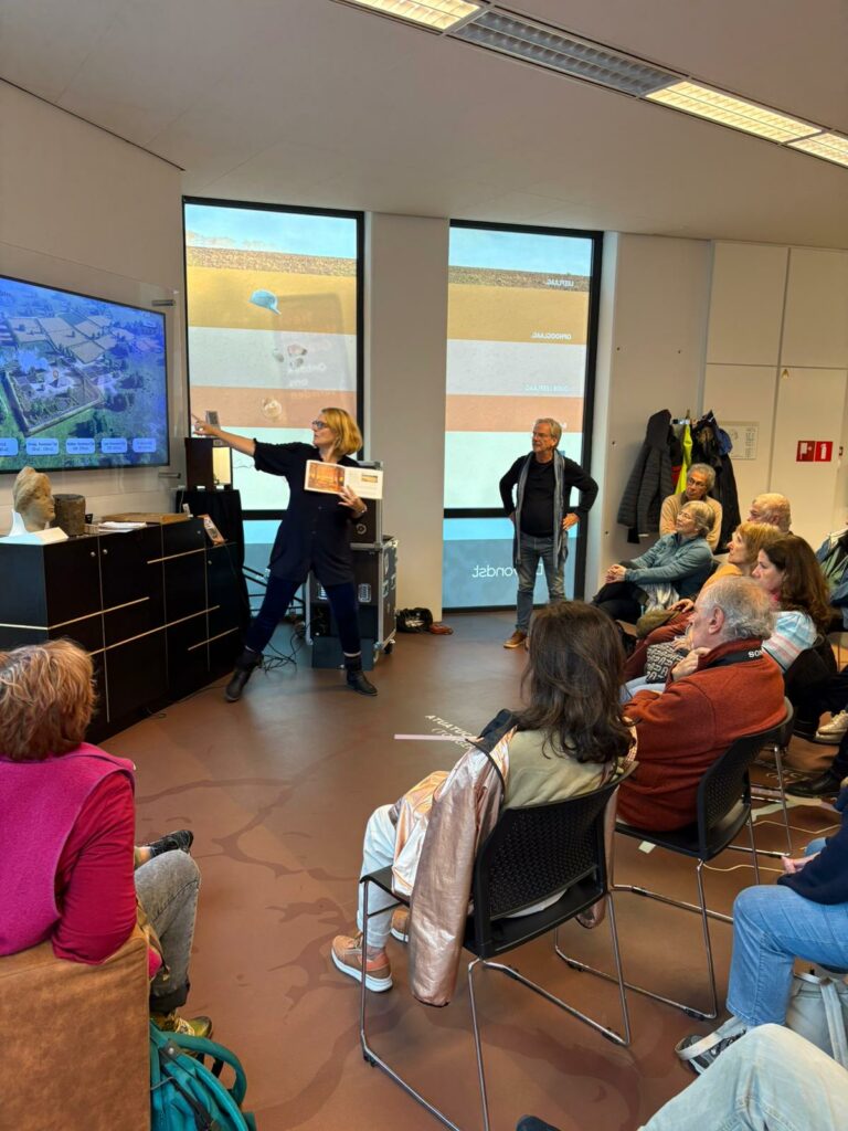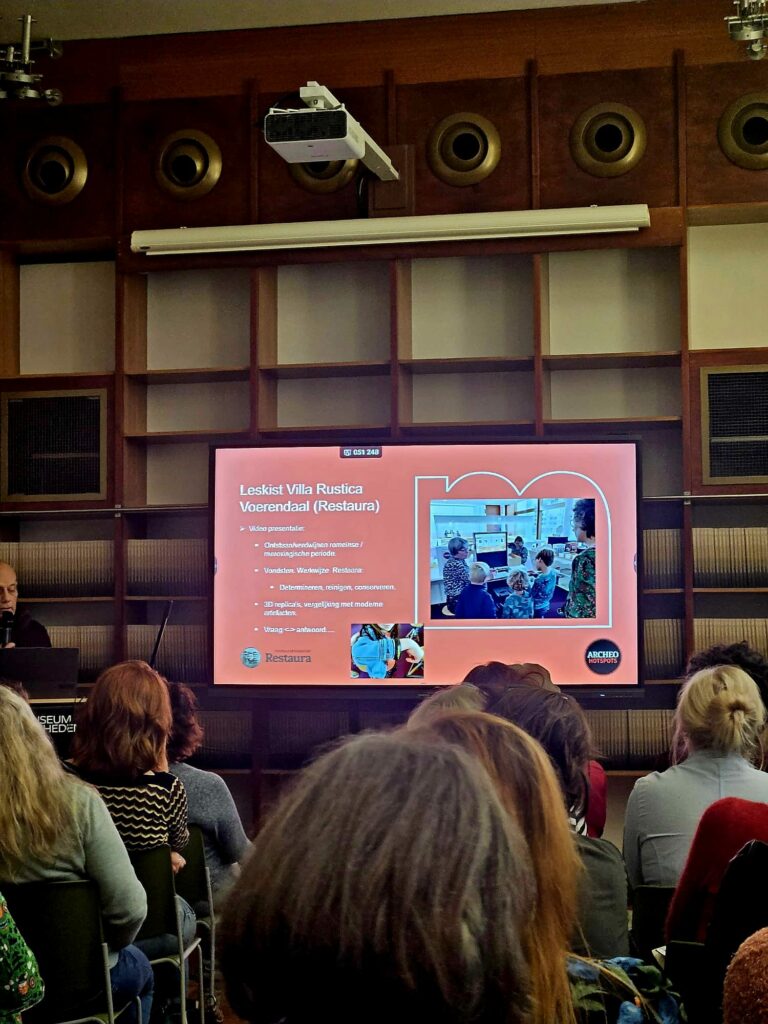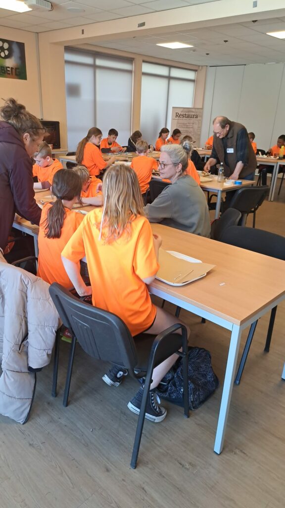 Een select gezelschap van vijf archeologiestudenten en docent Mark Driessen bezocht onlangs Restaura. Vanuit Leiden keken bovendien 80 studenten mee met de livestream. Ze kregen een rondleiding in het atelier en er werd gesproken over het vak. Via Whatsapp konden ook de studenten in Leiden van zich laten horen.